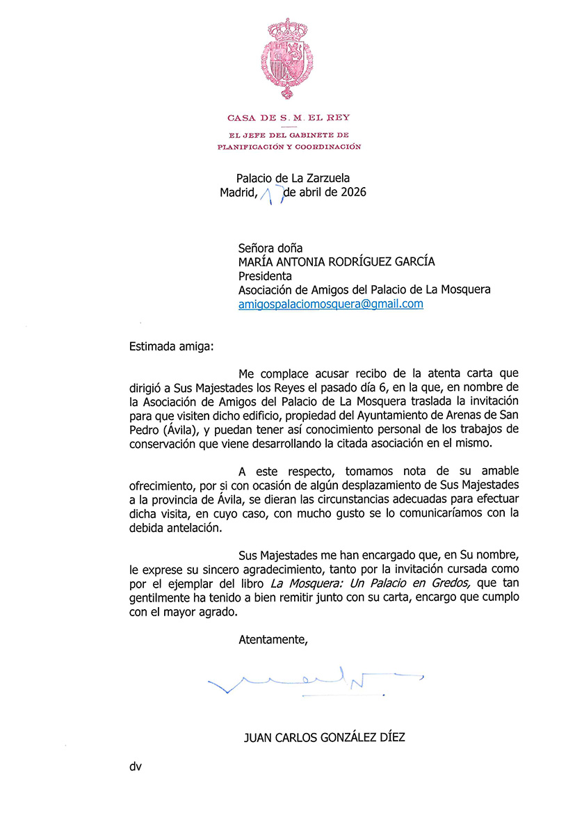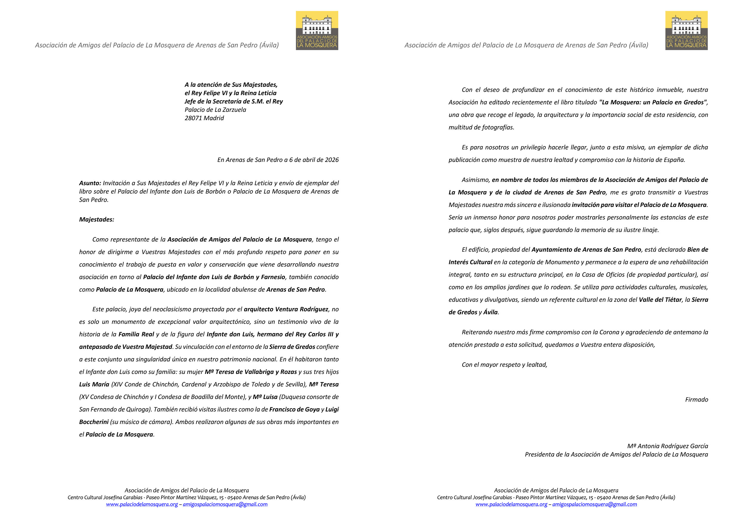 Asimismo, en nombre de todos los miembros de la Asociación de Amigos del Palacio de La Mosquera y de la ciudad de Arenas de San Pedro, me es grato transmitir a Vuestras Majestades nuestra más sincera e ilusionada invitación para visitar el Palacio de La Mosquera. Sería un inmenso honor para nosotros poder mostrarles personalmente las estancias de este palacio que, siglos después, sigue guardando la memoria de su ilustre linaje.